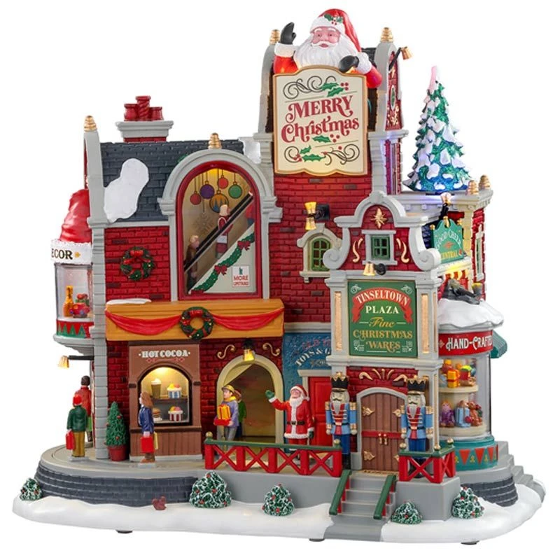 Lemax ‘Tinseltown Plaza’ is a unique festive shopping plaza full of fine Christmas wares. As music plays and lights shine, a big Santa sits on the roof, wishing everyone a Merry Christmas. With multiple moving parts, this christmassy shopping plaza will bring a heart warming element to your display.