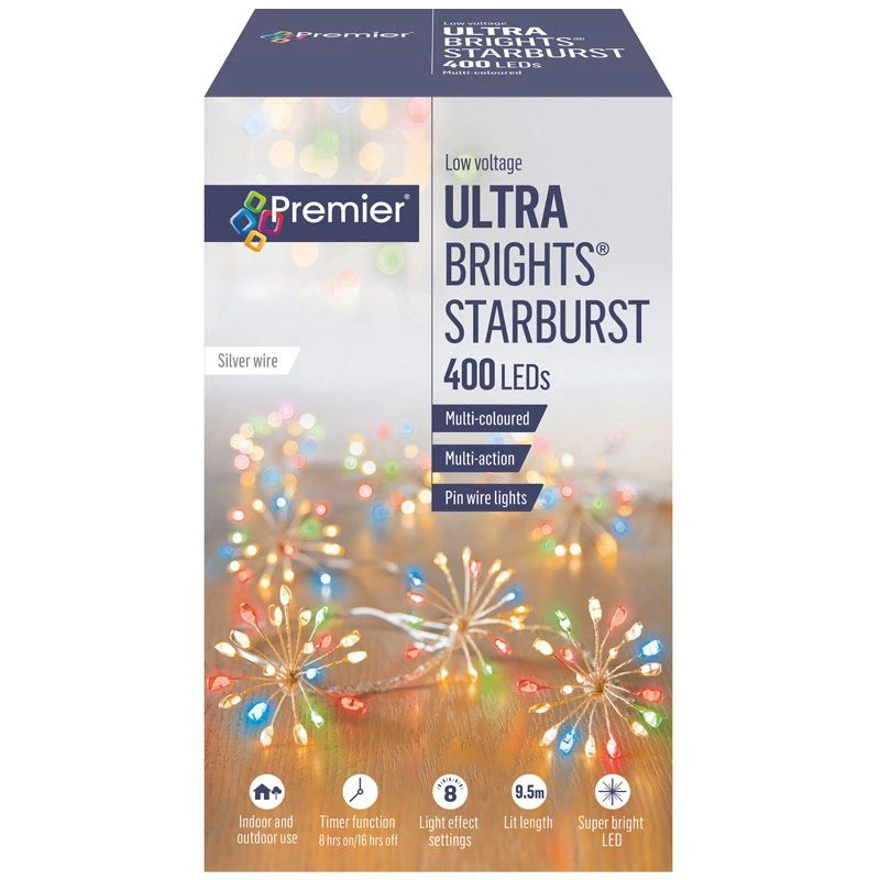 Super bright multi coloured LED Ultrabrights with Starbursts from Premier Decorations are perfect for decorating both indoors & outdoors this Christmas season. These large bulb LED pin wire lights are fitted with an easy to use push button timer which runs an 8 hour timer for on/off control. They are low voltage & energy efficient with multi-action display functions.