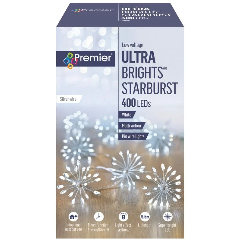Bright white LED Ultrabrights with Starbursts from Premier Decorations are ideal for decorating all areas of your house this Christmas season, even outdoors. These large bulb LED pin wire lights are low voltage & energy efficient with multi-action display functions. They are fitted with an easy to use push button timer which runs an 8 hour timer for on/off control.